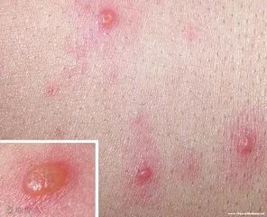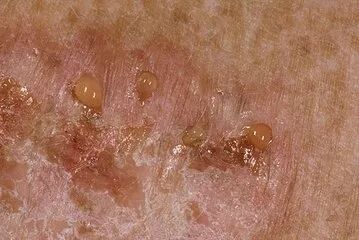 患部出现水疱,不易穿破,痒感明显,水疱出现数日后自然吸收,表面脱屑。此起彼伏,反复发作。