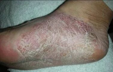 主要见于足趾间,表皮潮湿浸软色白,表皮剥脱后可见基底鲜红而糜烂,骚痒较重。可继发细菌感染而有恶臭。