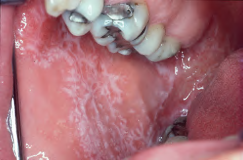 患者可能会有局部黏膜粗糙感、烧灼感。当吃辛辣、热、酸、咸味食物时,可能会感到局部灼痛。除口腔黏膜表现外,口腔扁平苔藓还可累及皮肤、生殖器黏膜及指甲、趾甲。