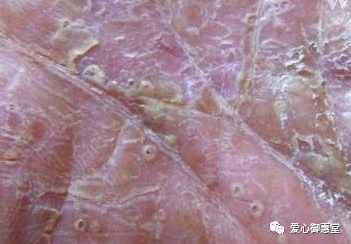 4.角化型 皮肤干燥粗厚、角化过度,皮肤纹理增宽,易发生皲裂,四季皆可发生,以冬季多见或加重。