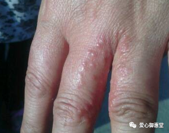 5.体癣型 手背部,损害以典型的弧状或环状的体癖改变,常并发体癣,以夏季多见或加重。