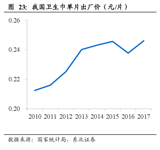 在其他国家的卫生巾降价的时候,中国的卫生巾价格却在逐年上涨。2011-2017年,国内卫生巾单片出厂价和终端销售价不断提升,单片出厂价从0.21元提升至0.25元,单片终端销售价从0.30元提升至0.44元,复合年均增长率达6.55%。
