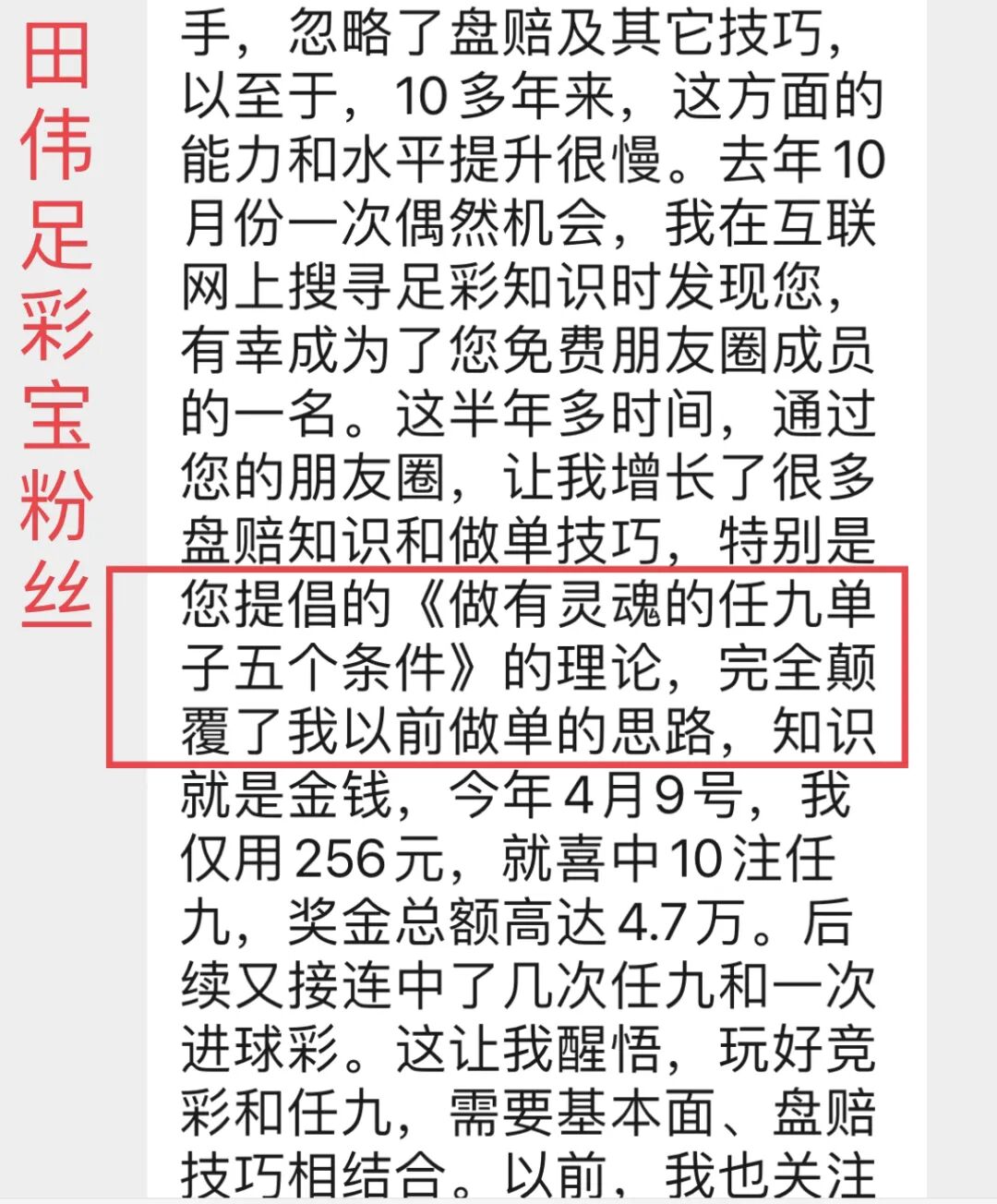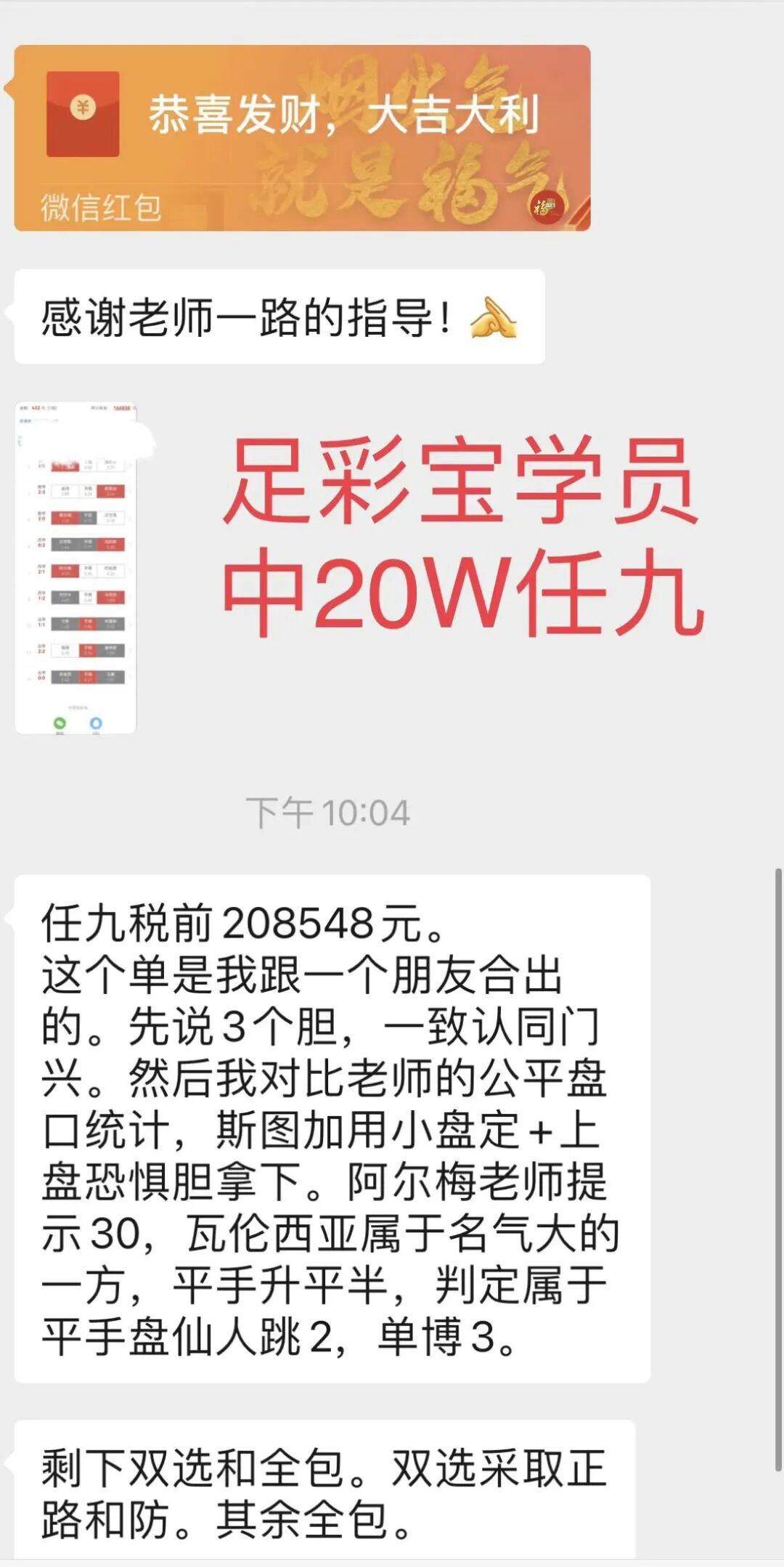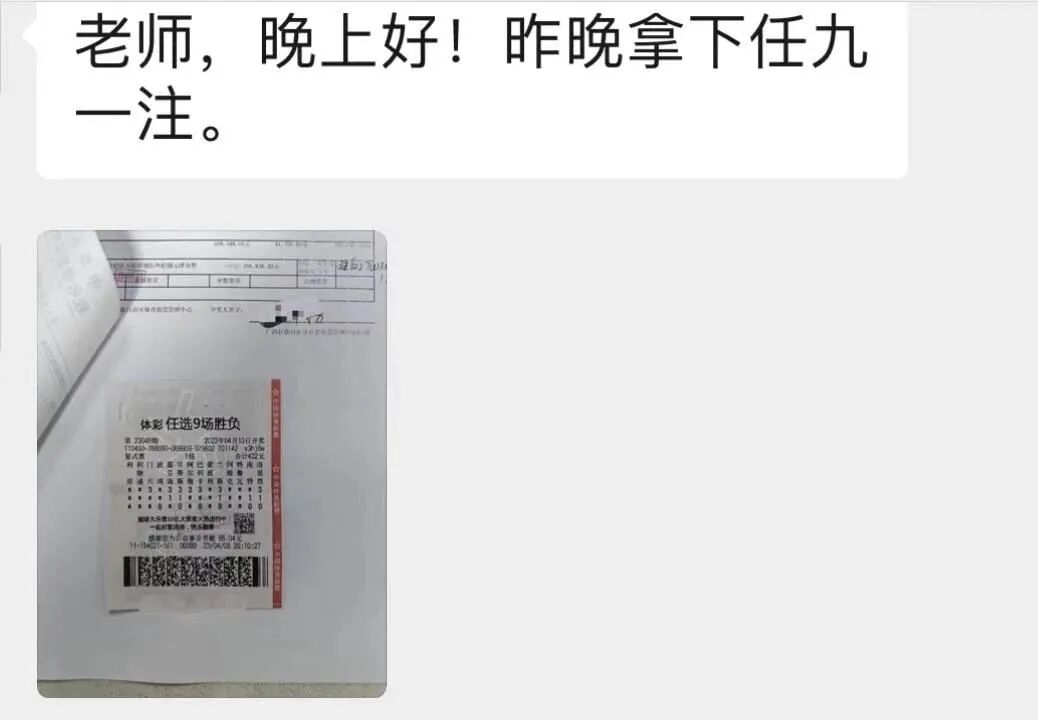 据我了解,平均下来,他一期14场基本投入在2000-4000左右,加上跟了学了五年如何做单,如何思考,有知识,再加上有资金的支持(我不鼓励这点,这是他的自由,他能承受就行),我印象中,他中过大奖至少2次,中小奖很多次了。我说这个意思是,你不用羡慕他,你能不能掏出他这些钱来?掏不出来,你大概率成为不了他。对于足彩中大奖而言,钱是很重要的一个因素。实际上,足彩宝学员里有大量是以小博大的经典案例,一单就把几年学费赚回来了。