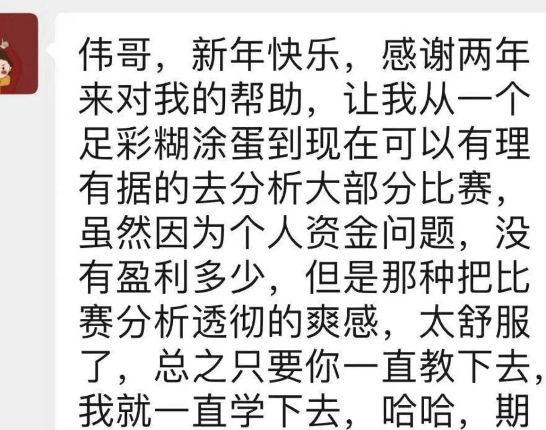 如果把足彩比作是和平年代的一场人性战争的话,你们算是跟随伟哥南征北战多年的老部下,咱们一起出生入死,同甘共苦,有的跟随我两三年,有的三五年,还有的兄弟是一直跟随了九年甚至没有足彩宝时就认识伟哥了,一个小小的爱好,让我们获得了一份缘分,我珍惜和感动,谢谢你们不离不弃!我时常反问自己,是什么让你们能追随伟哥一路走过三年、五年、七年甚至是九年呢,想来想去,两个字:信任;四个字:真诚与专业。