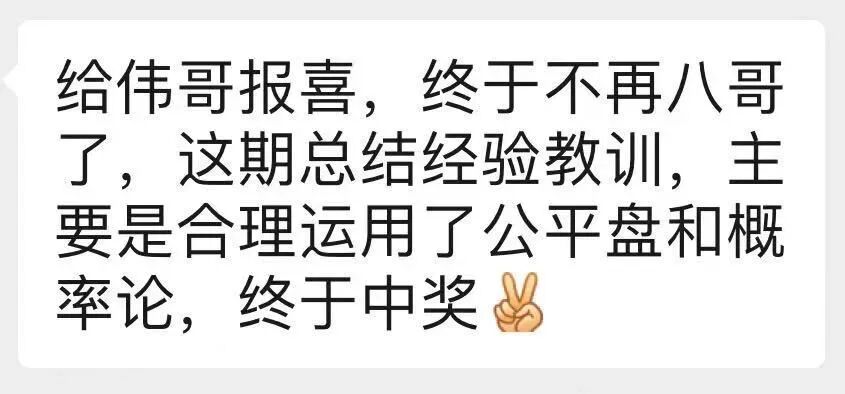 中奖,从来不是我衡量成功的唯一标准,中奖只是你付出努力思考,积极跟随伟哥学习,提高足彩认知这个过程之后的一种顺其自然的结果之一。你没有这个历练学习的过程,光想要那个结果,那就是想瞎了心了。