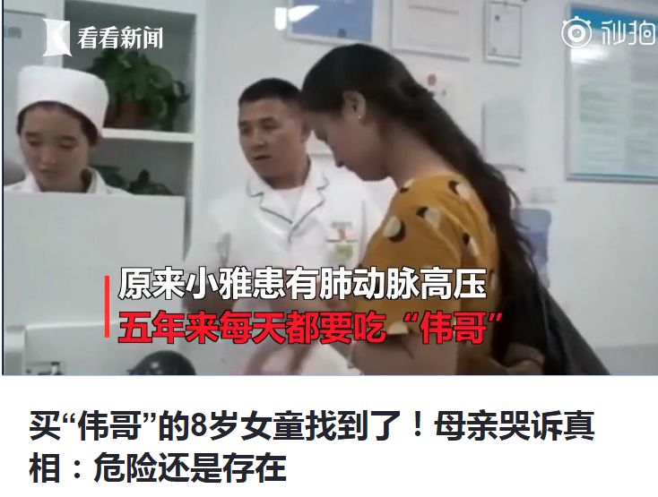 用伟哥治疗肺动脉高压,在患者之间早已不是秘密。今年9月,一则名为《买伟哥的小女孩》的视频流传于网络,河南许昌的8岁女孩小雅自己一个人跑到药店,要求买伟哥,而且一买就是十盒。药剂师在询问之下,小女孩的妈妈只好忍住眼泪解释,女儿是肺动脉高压患者,吃伟哥能救命。