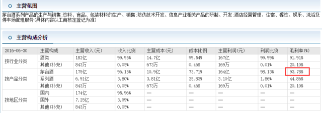 ▲贵州茅台2016年半年报显示,茅台酒的毛利率为93.78%