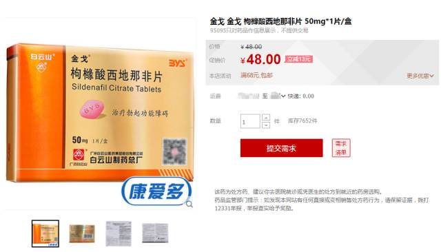 记者在康爱多大药房天猫旗舰店上看到,每盒1片装金戈享受13元优惠,满两盒还有买赠活动。每盒2片装的万艾可也有减10元、满两盒有赠品的促销活动。促销后,50mg规格的金戈价格比万艾可便宜78%。