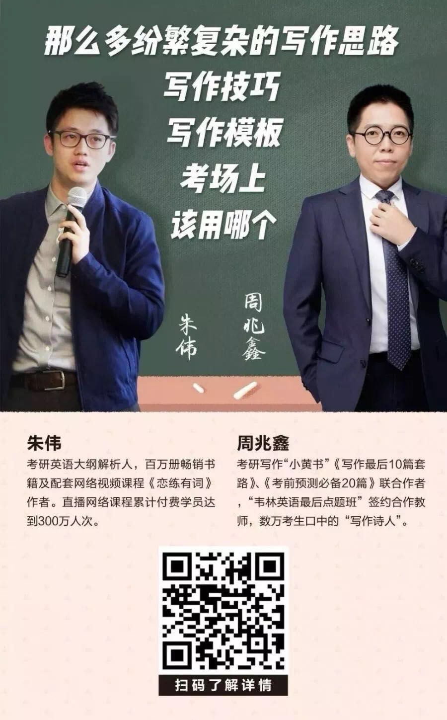 如果同学们看完了推文后还无法完全掌握英语图表作文写作套路。没关系,朱伟老师与周兆鑫老师联手的《写作最后终极总结点题班》,原价299元,现价19.9元。
