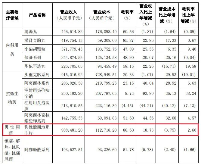 金戈目前在白云山的地位可比肩于万艾可之于辉瑞的重要性,以其2021年的销售业绩为例,财报数据显示,金戈2021年生产量超1.16亿片,销售量为9849万片,分别同比增长43.72%和25.72%,合计全年实现营收9.88亿,同比增长18.73%,其生产量和销售量仅次于白云山主要产品阿莫西林和头孢克肟,总营收则位居白云山所有产品之首。此外,金戈的毛利率也堪称出色,高达88.6%,接近于茅台,妥妥的赚钱小能手,而这还只是金戈一年的销售数据而已。