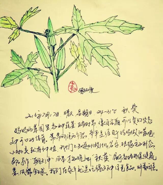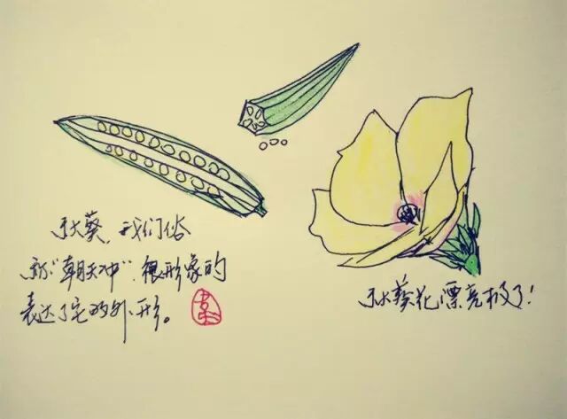 记得在我小时候家里就有种植,我不知叫什么名字,根据其形态就呼做朝天冲,后来才知道学名叫秋葵。这个秋葵的果荚要趁嫩吃,我们一般是炒着吃,脆嫩多汁,滑润不腻,香味独特。
