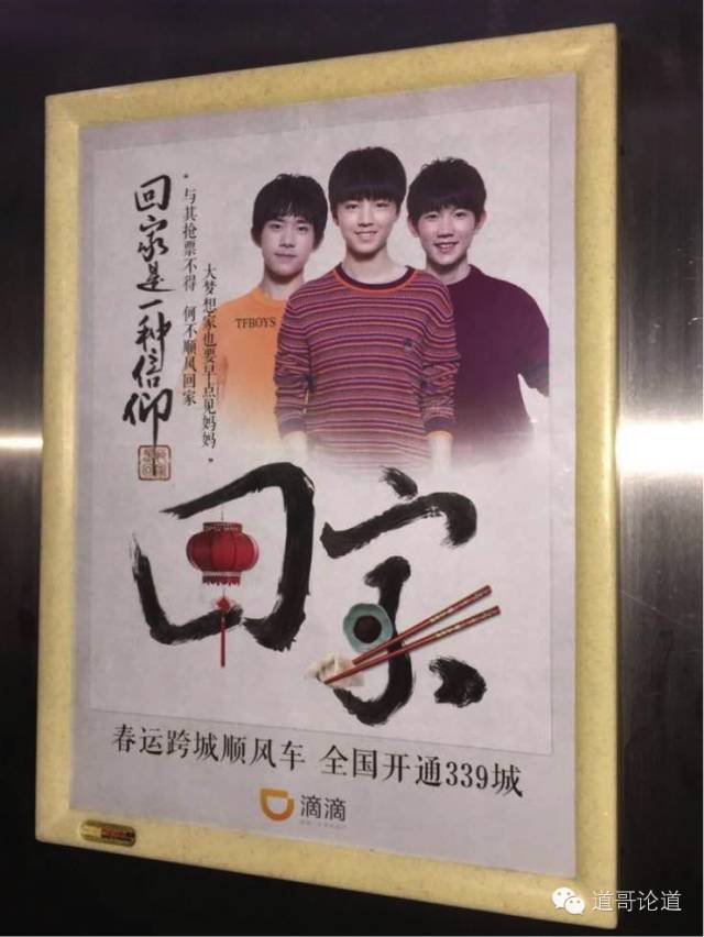 成熟品牌的传播不应仅仅停留于媒体广告对功能特性的重复播映来巩固品牌认知而是要做更深一步的选择:例如与特定的时机与特定生活场景消费场景结合来形成情感共振来激发消费行动(例如春节前买不到回家乡的票,回家一进电梯就看到滴滴顺风车,【回家是一种信仰,与其抢票不得,不如顺风回家】