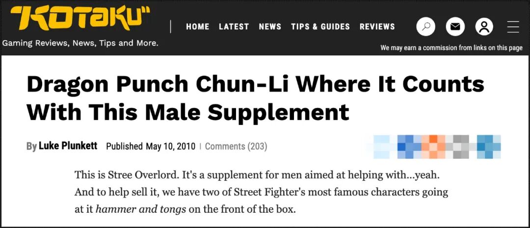 几年前,国外游戏媒体kotaku也报道过当时在社群非常有话题性的这种男性保健品,人们惊讶于拿春丽瑟图的封面,议论纷纷。