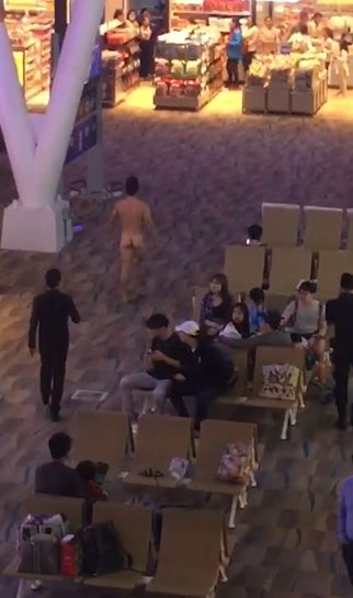 当时乘客们正在泰国普吉国际机场等待,忽然看见一名男子脱下了衣服,裸体四处走动。