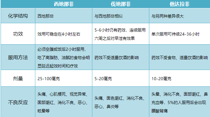 西地那非、伐地那非和他达拉非片分别呈蓝、橙、黄色三足鼎立,成为开启性福之门的一把金钥匙,占据着治疗勃起功能障碍药的主流市场。他达拉非在三个药品中,作用维持时间最长,单次服用可持续24-36小时;伐地那非作用时间略短,持续5-6小时;西地那非最短,一般大约4个小时。三种抑制剂均可在性生活前1小时左右服用,服用后需要足够的性刺激才能起效。疗效与足够的性刺激、剂量、服药与性生活间隔时间等因素有关。