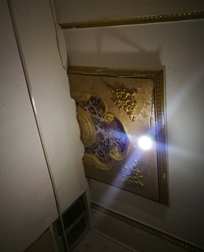 房间中那天花板上的装饰明显是东北九十年代时的流行风格,夸张的大花图案被敲起来声音无比清脆的硬纸板墙和一扇不用力就关不上的破门非常突兀地分成了两半。