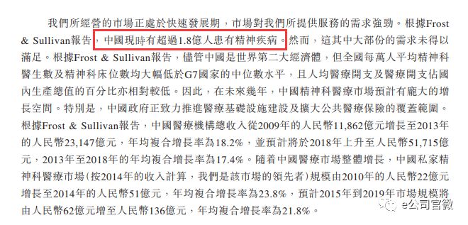 康宁医院是目前国内最大的民营精神专科医院,被称为精神病院第一股,已在香港成功上市。其在申请香港上市的文件中引用市场研究顾问的数据称,中国现时有1.8亿人患有精神疾病,其中大部分需求未得以满足。