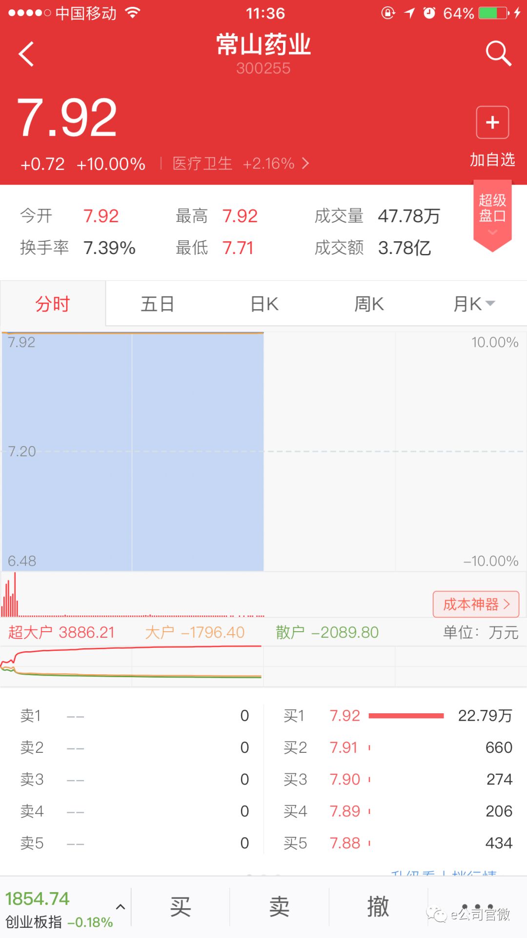 常山药业以涨停价7.92元/股高开,开盘后短暂打开涨停板后迅速回封,当前封单达到23万之多。半日成交明显放量至3.78亿元,换手率高达7.84%。