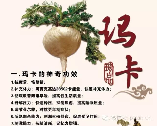 MACA(玛卡),一种生长在南美洲秘鲁安地斯山区海拔四千米以上的高原上的植物。数千年来MACA一直被印加人看做是安地斯山神赐的礼物,当时印加人除了把MACA当成果腹的食物外,还意外发现MACA可以增加体力、增强耐力以及抵抗疲劳的力量,同时又可以增强人类及动物的性能力及生育力,也就是因为MACA的神奇效用,印加人就靠着MACA补充能量,军队个个体胳强壮,并建立了空前绝后的印加大帝国。