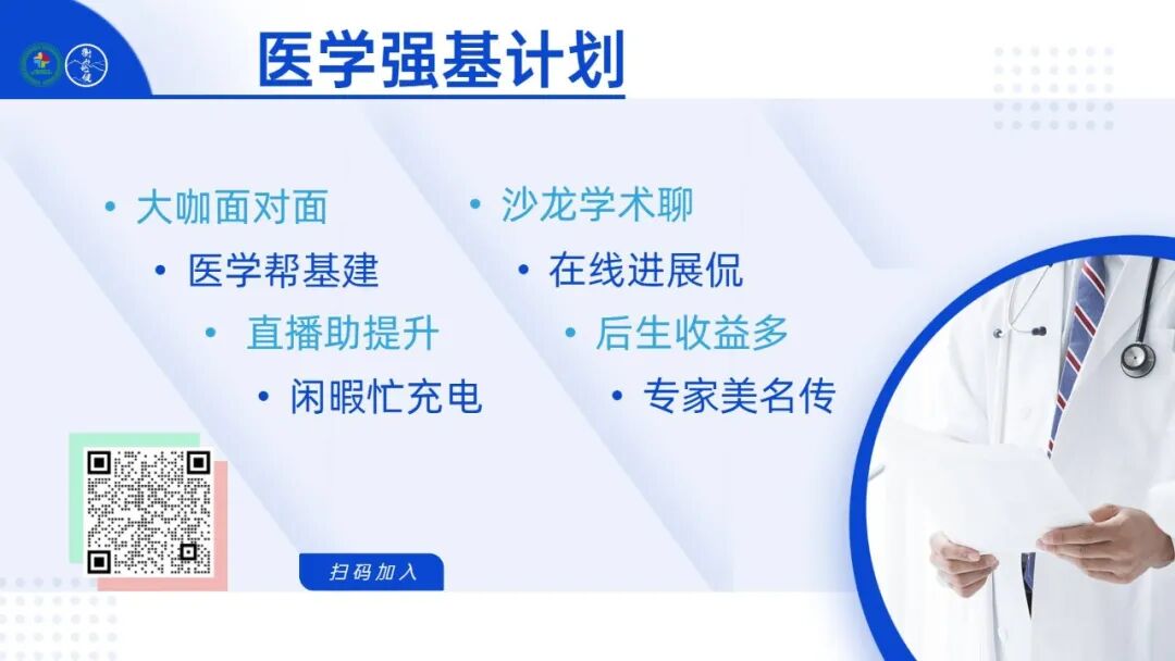 敬请扫码加入医学强基计划,免费享医学百家讲坛防癌论健讲坛中西医结合肿瘤学院阿尔茨海默病学院公益医学论文写作讲座学院" 免疫大数据学院大医IP研习社等免费直播课。