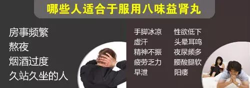 ★八味益肾丸是配方中药,补阳同时滋阴,补而不燥,补肾不透支。特别适合于以下人群服用: