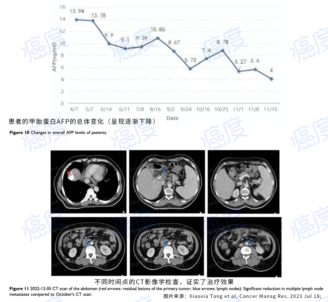 经过多学科MDT会诊后,给予患者每天一次每次12毫克的仑伐替尼治疗,联合PD-1抑制剂卡瑞利珠单抗,每三周一次,每次200毫克。其中还使用了卡培他滨和奥沙利铂来治疗胃肠道的恶性肿瘤,经动脉化疗栓塞TACE来治疗肝细胞癌,并进行肝顶部止血。这5种药联合治疗效果更有效,但是副作用也大。患者先后出现了二级骨髓抑制、血小板减少、肝酶轻度升高、高血压等。经过医生予以辅助药物得以控制。经过3个月的治疗,AFP从13.78ng/mL下降到9ng/mL,转移的淋巴结坏死,肿瘤已经得到了初步缓解。