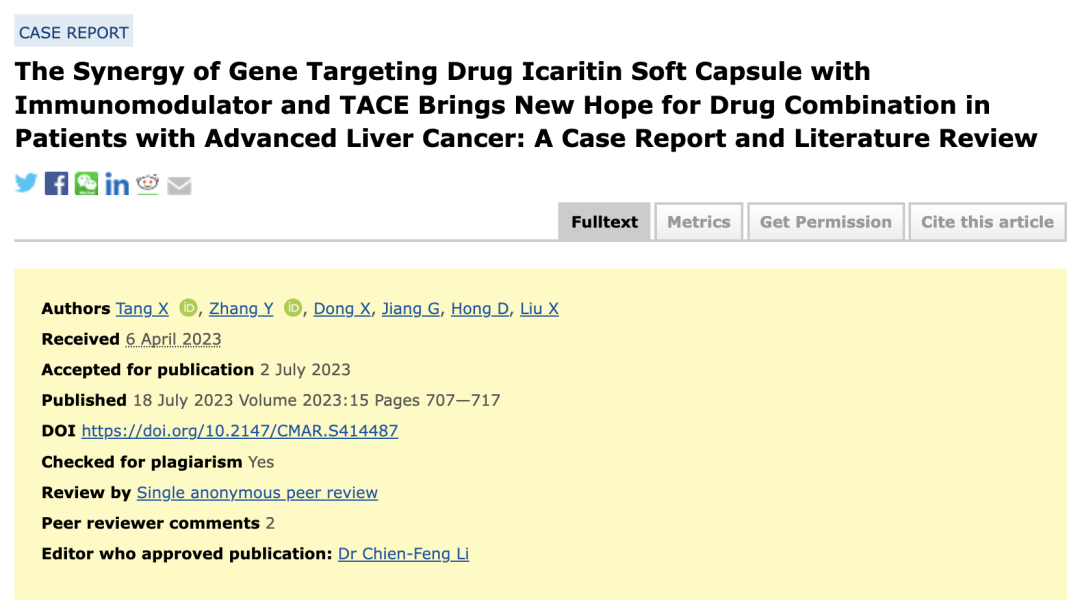 Xiaoxia Tang et al, The Synergy of Gene Targeting Drug Icaritin Soft Capsule with Immunomodulator and TACE Brings New Hope for Drug Combination in Patients with Advanced Liver Cancer: A Case Report and Literature Review, Cancer Manag Res. 2023 Jul 18;