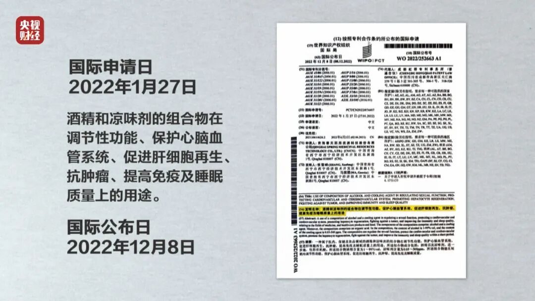 一位工作人员告诉记者,听花酒的健康性是有国际专利的。记者在世界知识产权组织国际局官网查询,听花酒提交的《酒精和凉味剂的组合物在调节性功能、保护心脑血管系统、促进肝细胞再生、抗肿瘤、提高免疫及睡眠质量上的用途》在国家处理状态一栏显示空白,负责这份专利代理人解释:谁都可以申请公布自己的所谓发明专利,但能不能被认定为专利,则是另一回事。