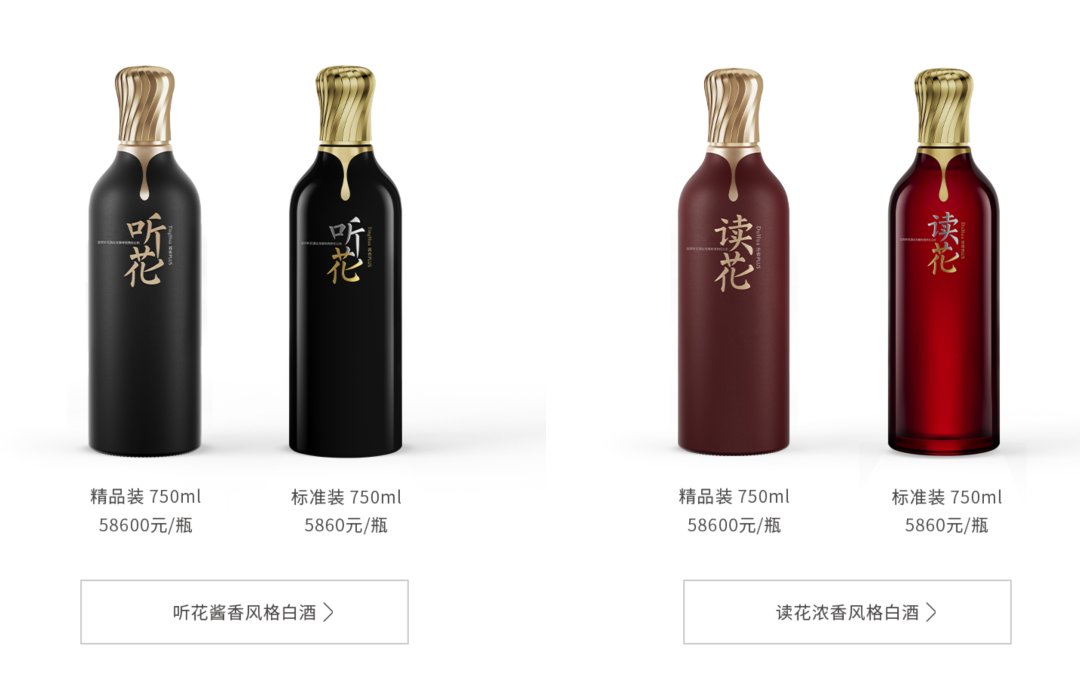 官网相关信息显示,听花酒旗下包括听花酱香风格白酒和读花浓香风格白酒两大系列。其中听花酱香风格白酒精品装和标准装定价分别为58600元/瓶和5860元/瓶。读花浓香风格白酒精品装和标准装定价同样为58600元/瓶和5860元/瓶。