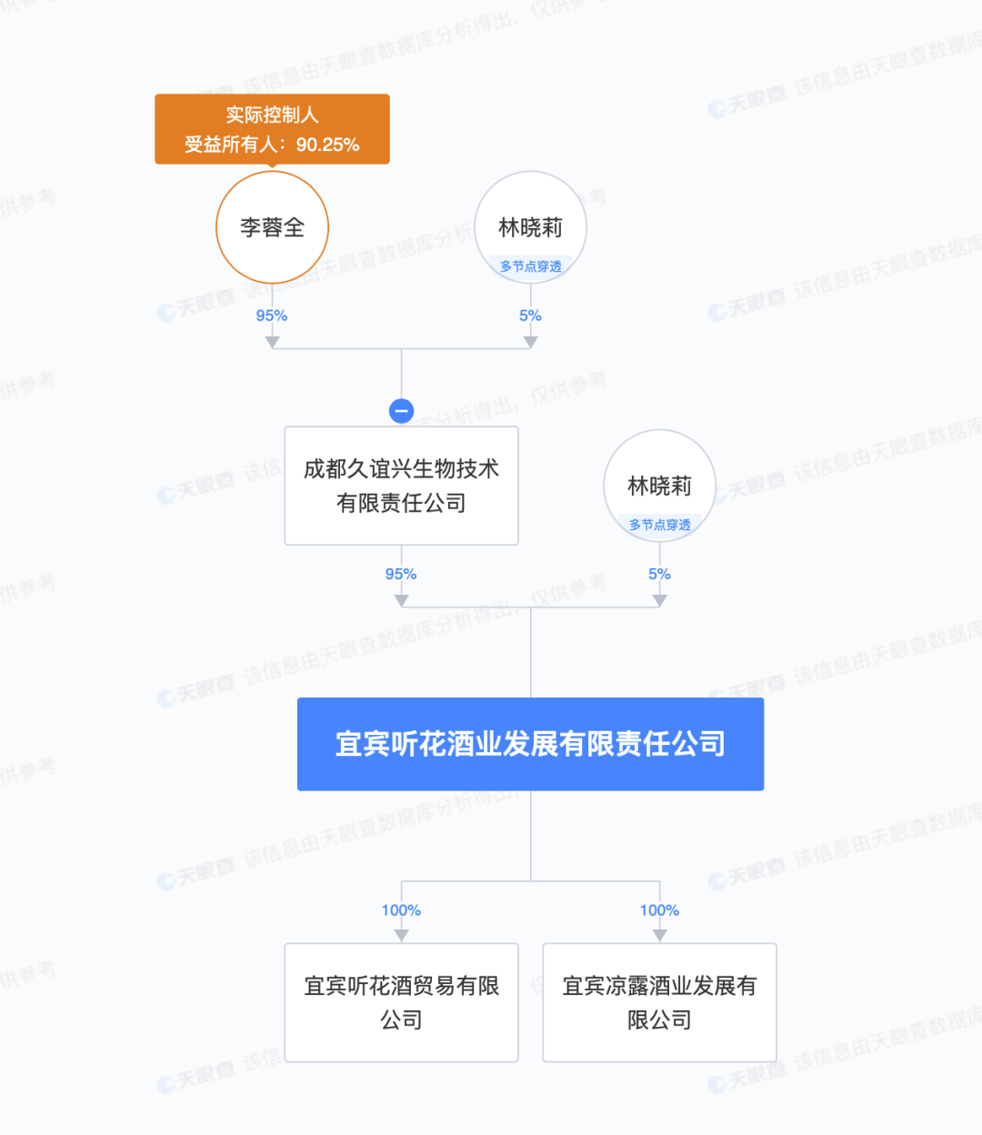天眼查APP显示,宜宾听花酒业发展有限责任公司,成立于2012年12月13日,法定代表人:李蓉全,注册资本1470万人民币。2022年员工人数114人。实控人为李蓉全。