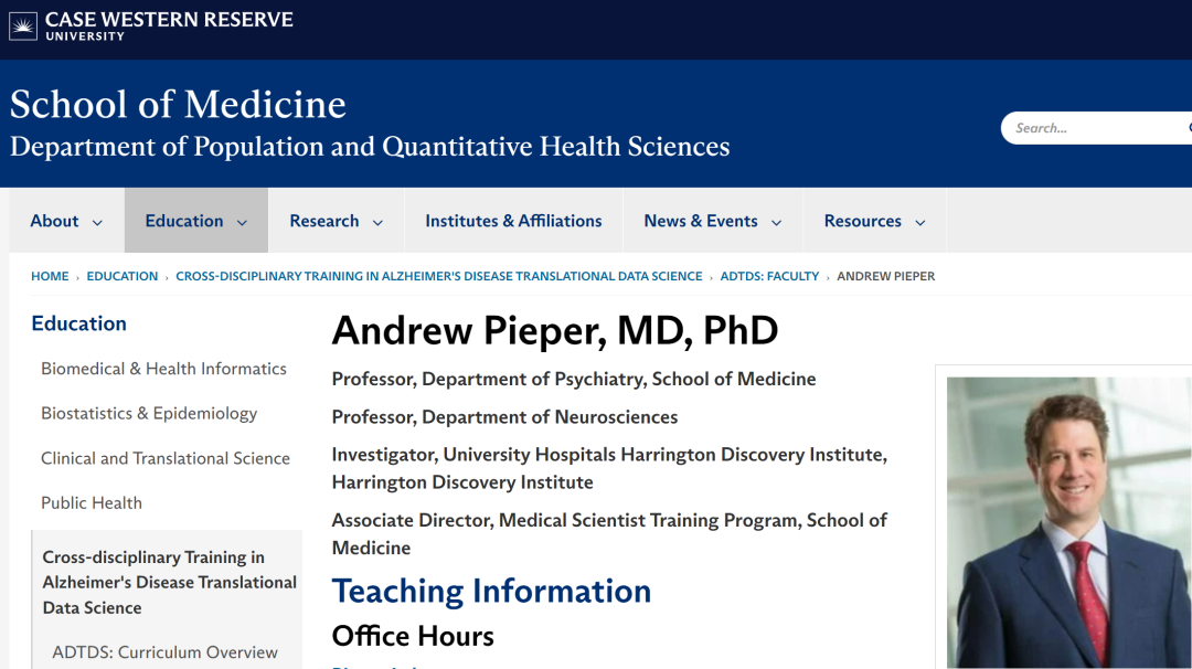 为此,程博士与包括医学博士Jeffrey Cummings和Andrew A. Pieper在内的临床医生紧密合作。Cummings 博士是拉斯维加斯克利夫兰诊所鲁沃脑健康中心(Luo Ruvo Center for Brain Health)的创始主任。Pieper 博士在路易斯·斯托克斯克利夫兰退伍军人医疗中心(VA Medical Center)开设了一家精神科诊所,并在凯斯西储大学(Case Western Reserve University)和大学附属医院开设了一家神经生物学实验室。