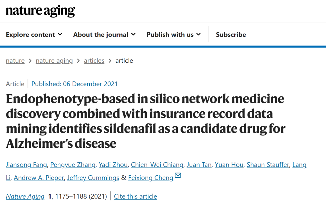 [1]. Fang, J., Zhang, P., Zhou, Y. et al. Endophenotype-based in silico network medicine discovery combined with insurance record data mining identifies sildenafil as a candidate drug for Alzheimer’s disease. Nat Aging 1, 1175–1188 (2021). https://doi.org/10.1038/s43587-021-00138-z