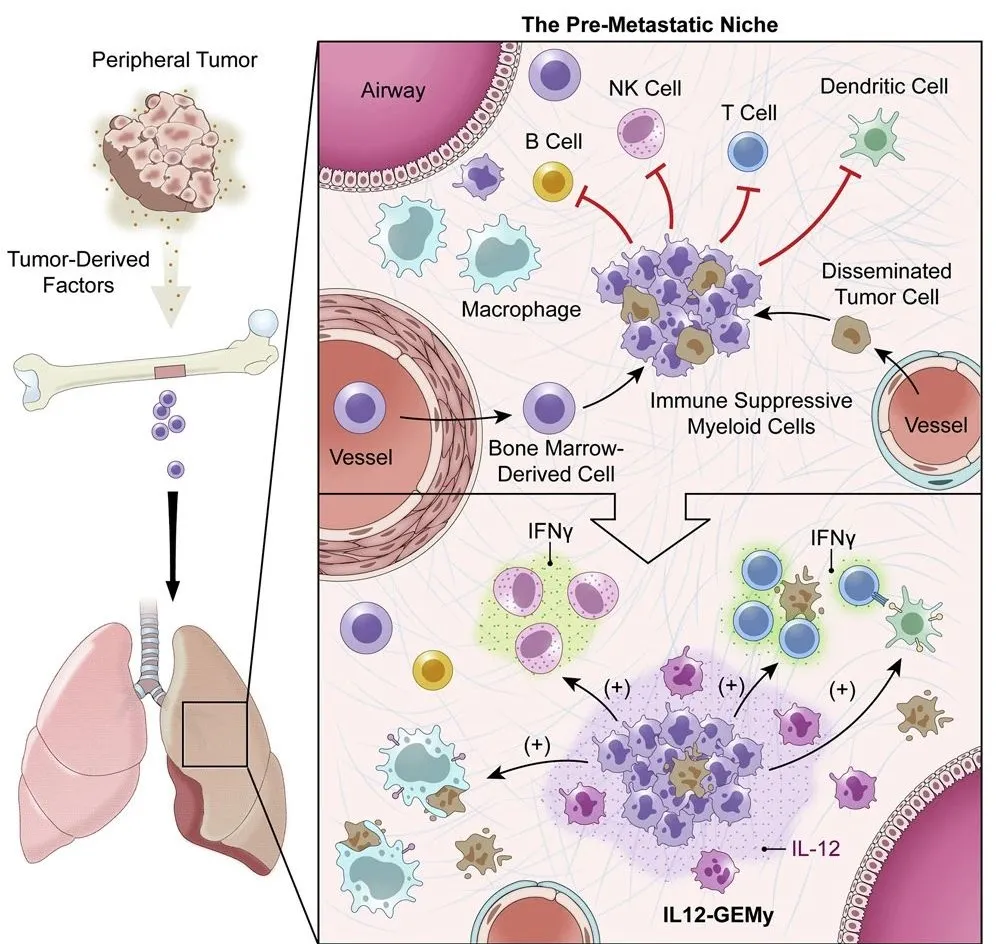 2021 年 3 月 25 日,美国国家癌症研究所Rosandra Kaplan 教授团队在Cell杂志上发表论文Genetically engineered myeloid cells rebalance the core immune suppression program in metastasis,研究人员利用基因编辑的方法在小鼠髓细胞多加进去一条产生 IL-12 的基因,使得杀死癌细胞的免疫细胞数目增加,并减少了抑制免疫功能的信号。经改造后,小鼠肺部的癌症转移速度减缓,肿瘤稳定地变小,生存期变长。