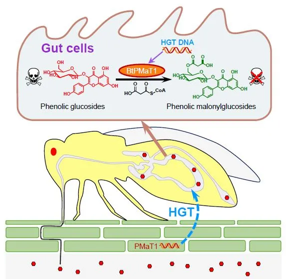 2021 年 3 月 26 日,中国农业科学院蔬菜花卉研究所张友军团队在Cell发表封面文章Whitefly hijacks a plant detoxification gene that neutralizes plant toxins,首次以烟粉虱(Bemisia tabaci)这一类能危害 600 多种植物的超级害虫为例,揭示了昆虫的自我保护机制。令人惊讶的是,昆虫通过基因转移的方式获得了 BtPMaT1 基因,用以分解酚糖,防止植物有毒分子积累所带来的损伤。因此研究者设计了一种抑制 BtPMaT1 基因表达的小干扰 RNA 注入番茄中,食用番茄的烟粉虱成虫的死亡率增加,产卵繁殖受到抑制。