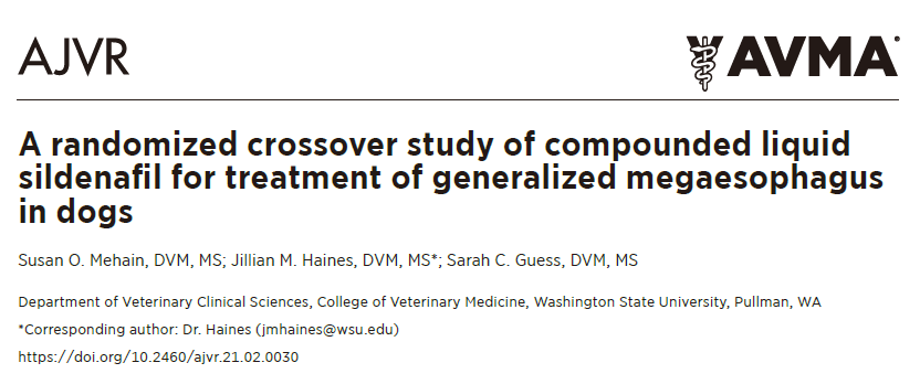 近日,美国华盛顿州立大学兽医学院的研究人员在《美国兽医研究杂志》"American Journal of Veterinary Research"期刊上发表了一篇题为" A randomized crossover study of compounded liquid sildenafil for treatment of generalized megaesophagus in dogs "的研究论文。