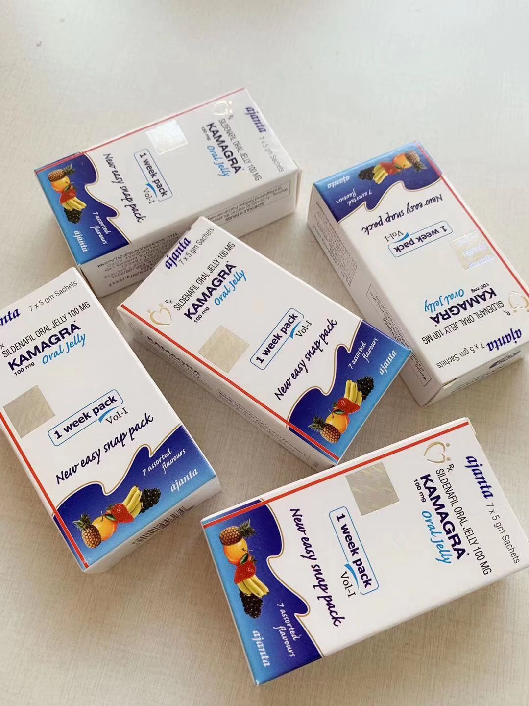 Kamagra果冻一盒有7种不同的口味,菠萝,橙子,草莓,香草,香蕉,黑醋栗和奶油糖。Kamagra果冻不需要用水吞服,可以在口腔中直接溶解,没有任何不便。
