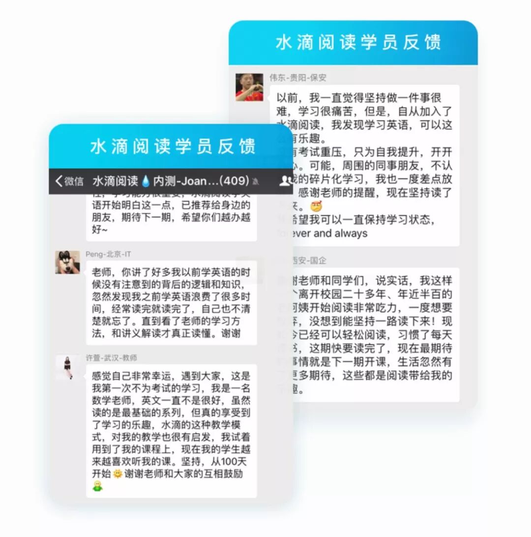 为已经离开校园的你还原真实班级学习环境,结识志同道合的英语爱好者。下面的真实学员反馈,证明了水滴阅读能够帮助大家有效的提升英语水平,并且可以让上班族、学生党、新晋爸妈、拖延症患者...都能一直坚持学英文。