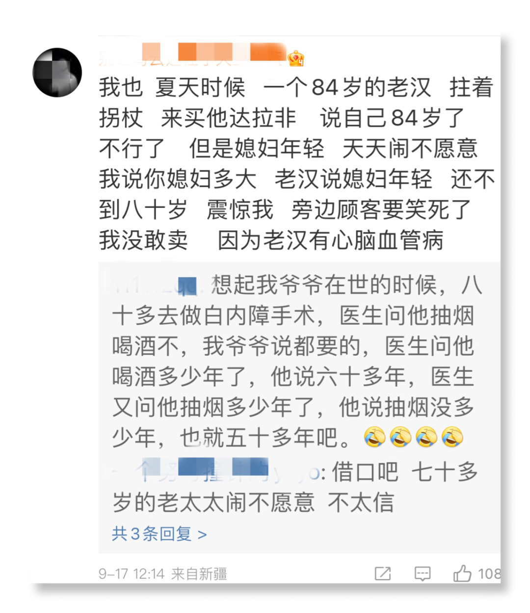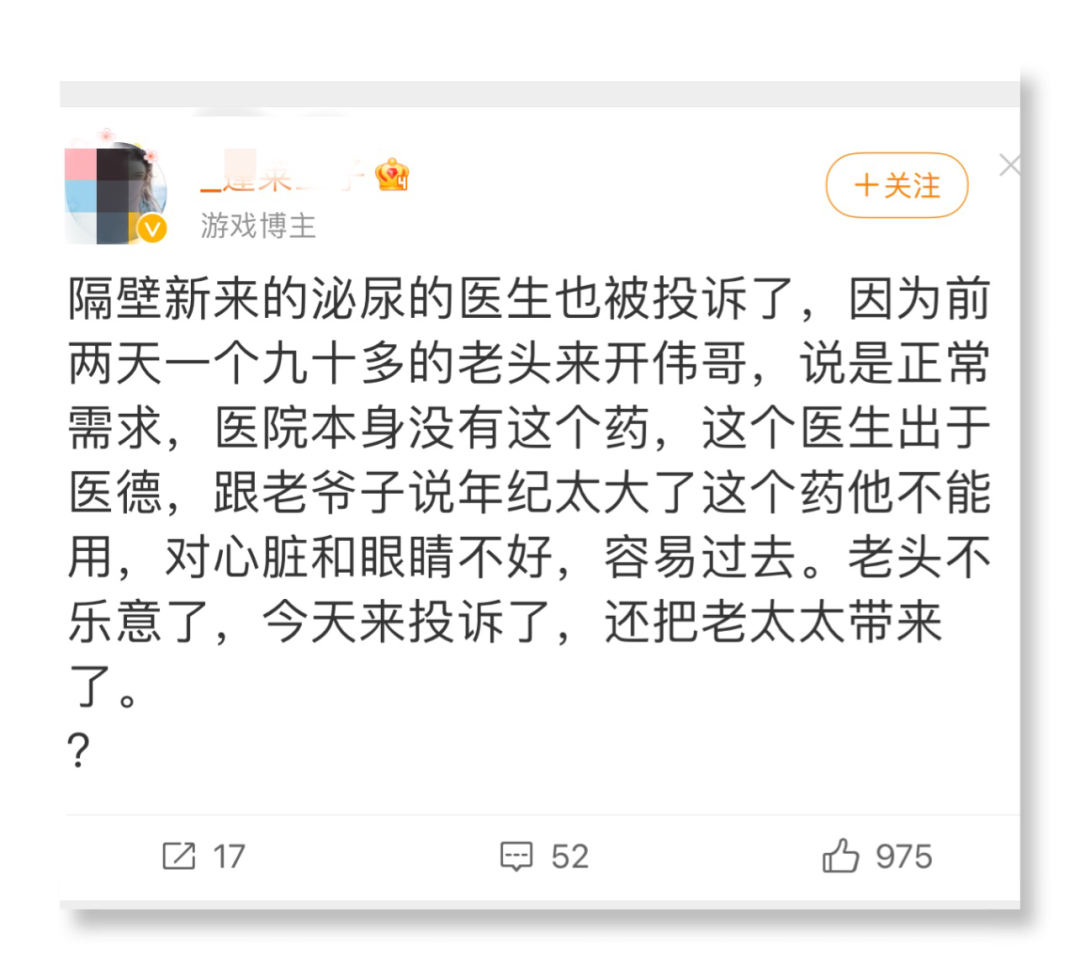 9月16日,一医生发博称,一位九十多岁的老汉来医院泌尿科让开伟哥,说是正常需求,但一是医院没有这个药,另外医生出于医德,就跟老爷子说年纪太大了这个药他不能用,对心脏和眼睛不好,容易过去。不料老人不乐意,把医生投诉了。