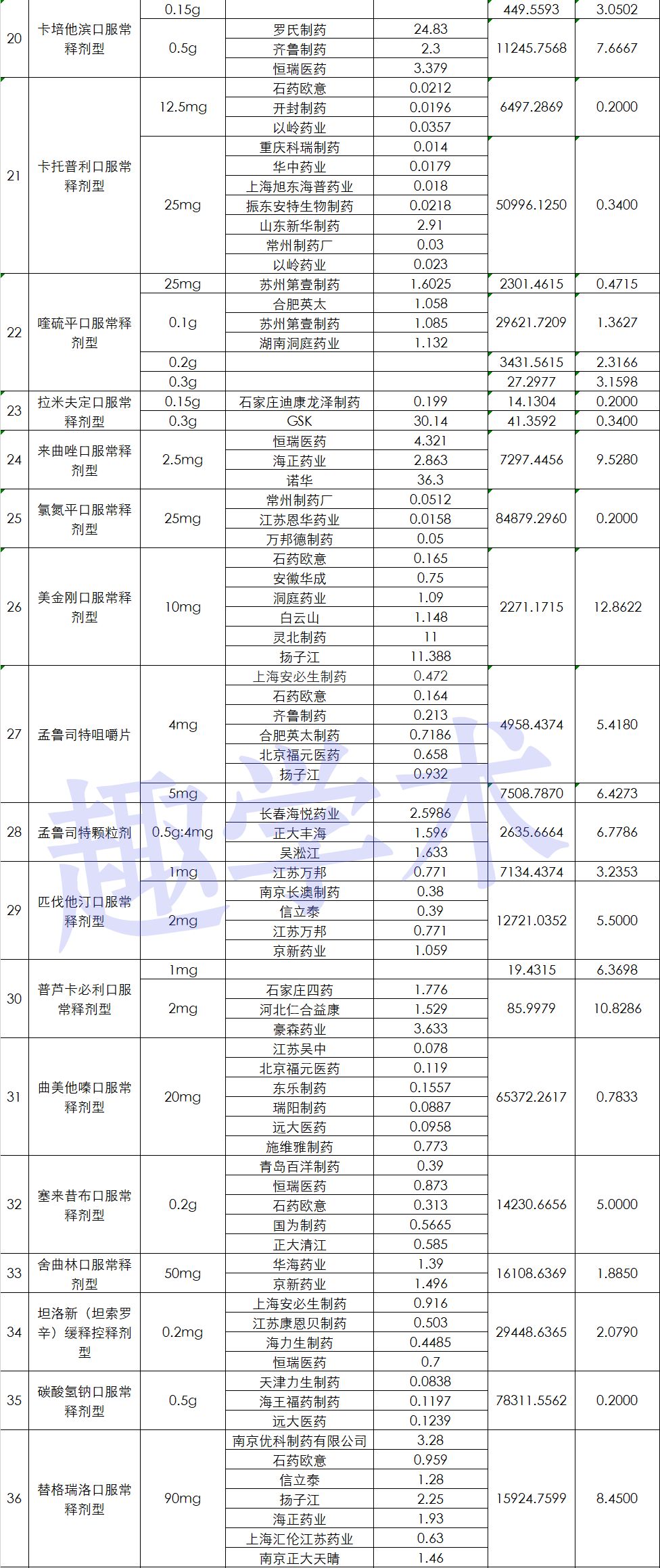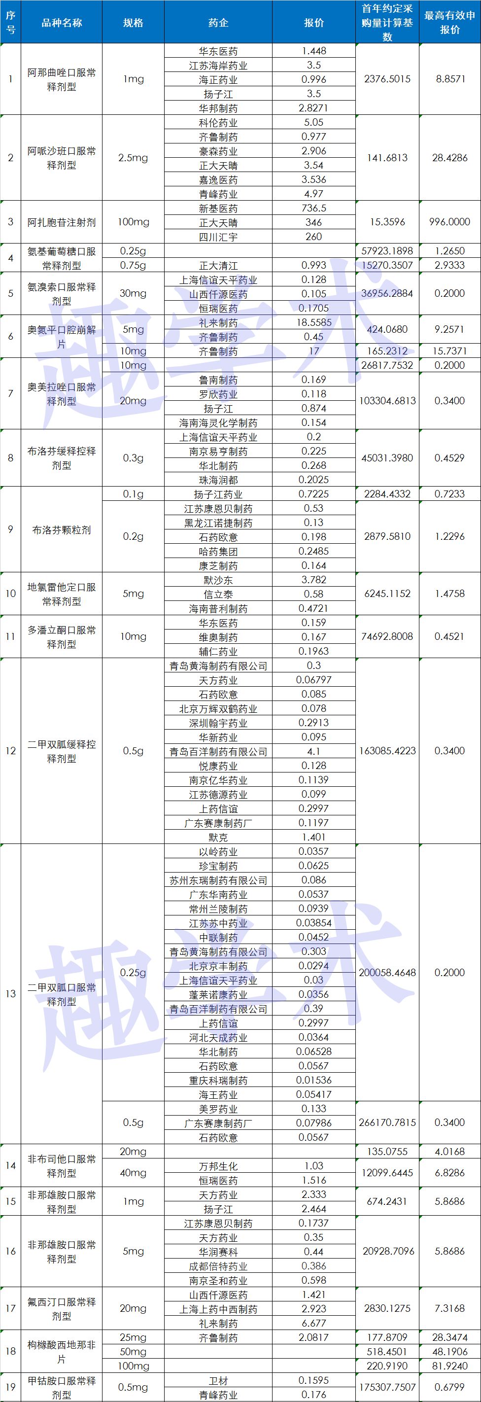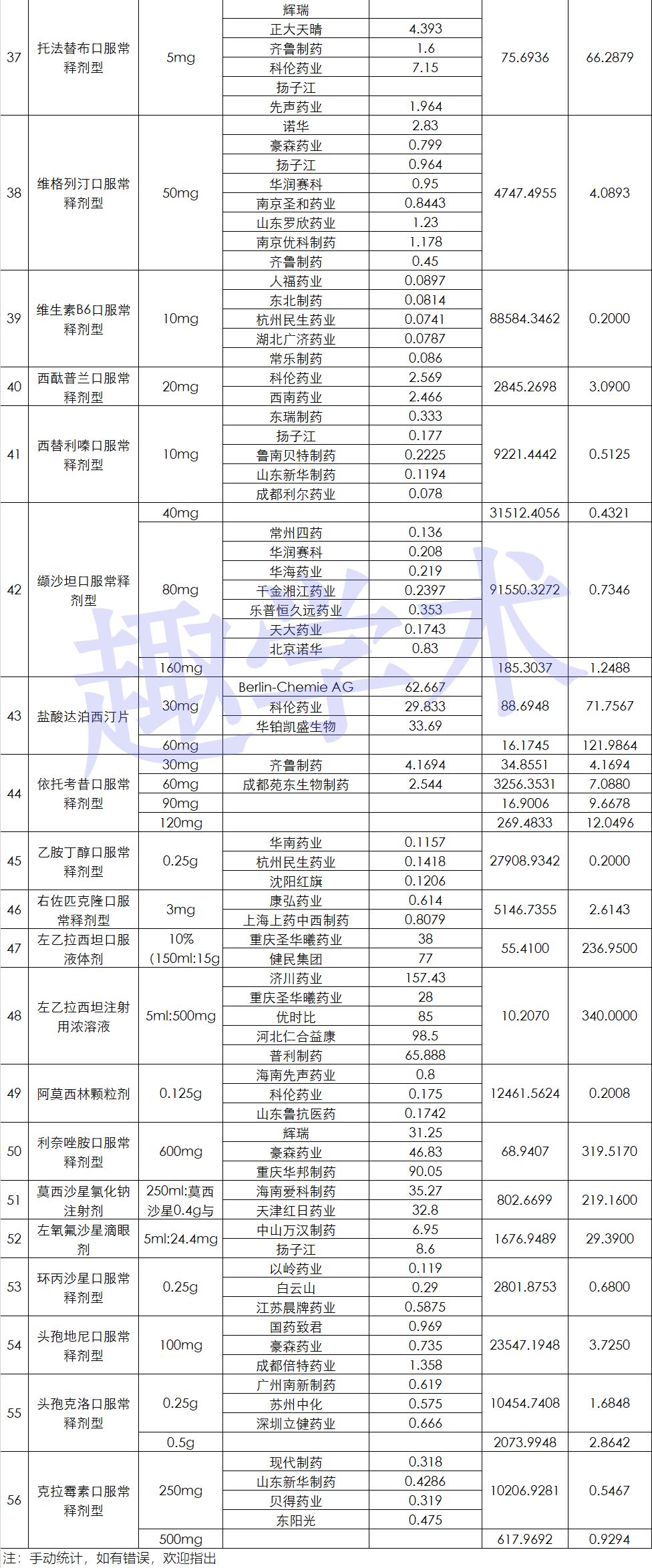 根据坊间流出报价图片,趣学术整理了56个品种的部分药企报价: