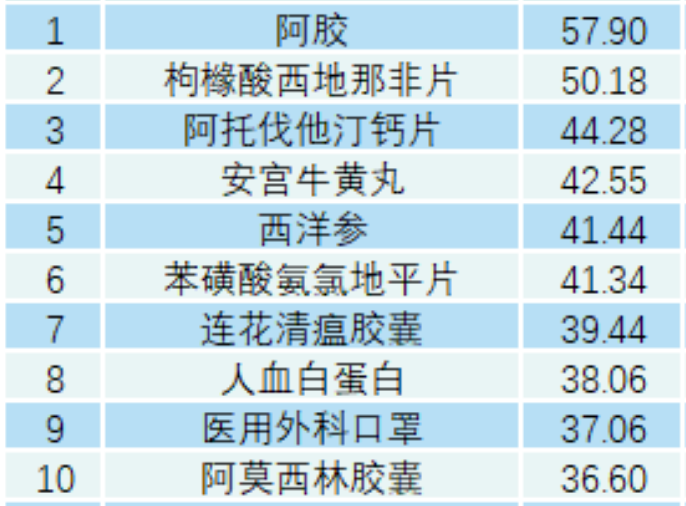 阿胶、枸橼酸西地那非片、阿托伐他汀钙片、安宫牛黄丸、西洋参、苯磺酸氨氯地平片、连花清瘟胶囊、人血白蛋白、医用外科口罩、阿莫西林胶囊。