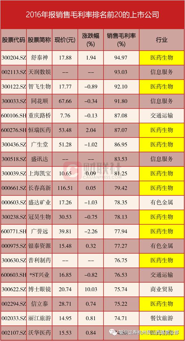 根据公开资料显示,2016年年报销售毛利率排名前20的上市公司中,医药生物独占11席。这并不是偶然现象,事实上,将每一年的年报数据做比较,可以发现医药生物行业始终处于高毛利排行榜中。