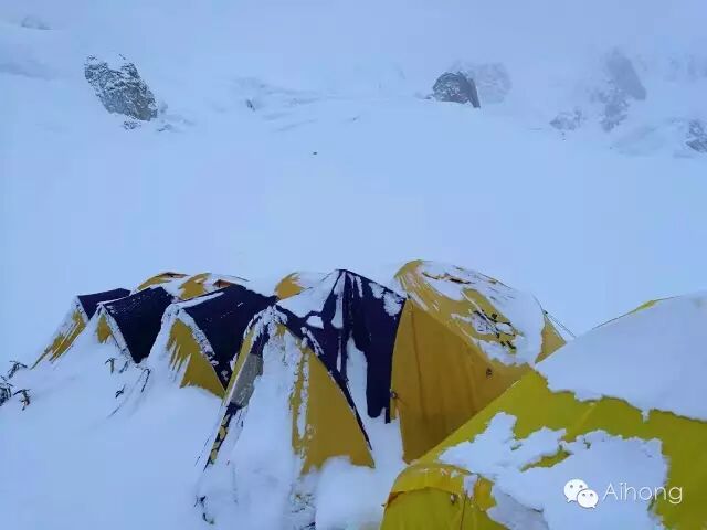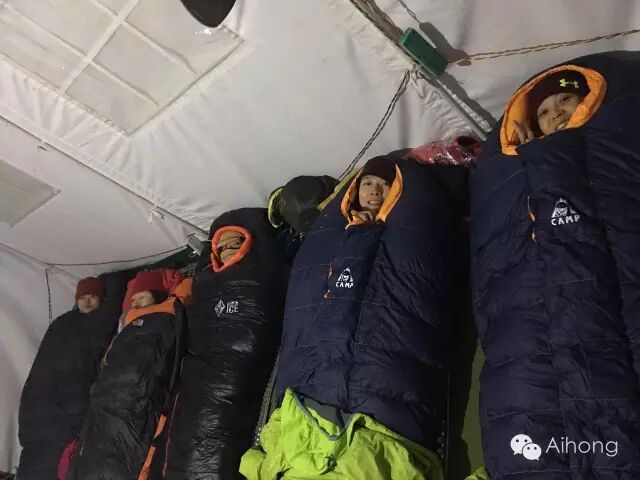 由于前夜的大风,C1的帐篷被风吹跑了。在营地附近吹着凛冽的山风,吃了半个小时瓜子后,协作们寻找到失落的帐篷回来了。从一号营地起开始住高山帐篷,三人一组。帐篷小得不能再小,并排放下三个防潮垫就再没有任何空隙了。这是对胖子赤果果的歧视!