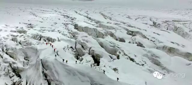 今天的队形是大家和协作们结组在绳上,由于存在个人速度差会导致个人休息点的差异,这需要大家积极配合步调一致,避免出现拉扯绳子的状况,尤其是在跨越裂缝区的时候更加需要大家的默契配合。如果羽绒服冰镐雪爪等掉落冰裂缝是没办法去捡拾的。