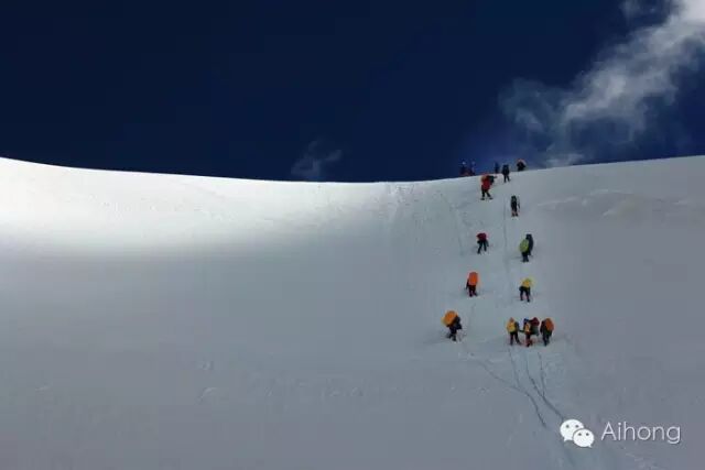 走了还没十分钟,一个70度的大雪坡矗立面前。先挂负保护,然后上升器,左手冰镐,右手上升器,用两只脚的脚尖尽力插入前面的脚印里面,绳索还在晃动着。一步,又一步,体力就像开大的水龙头,很快就流失殆尽。我大口大口地喘着粗气,四肢贴在雪坡上。这还能上得去吗?抬头看着上面逐渐消失的头灯,嚼了一口小雪片,又往下扔了一个小雪球,继续向上爬行。记不清吃了几口,扔了几个,终于上到了坡顶。过毛结,解开上升器。坡顶大雾弥漫,感觉很冷,手脚冻得冰凉。