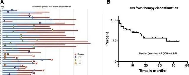 在这项临床数据中,有39名癌症患者接受免疫治疗后肿瘤得到了控制,但由于各种各样的原因,未用满2年就被迫提前暂停治疗。截止去年,有15名患者已经出现疾病复发进展,从暂停治疗到复发的中位时间为4个月,而另外24位患者的疗效一直维持。