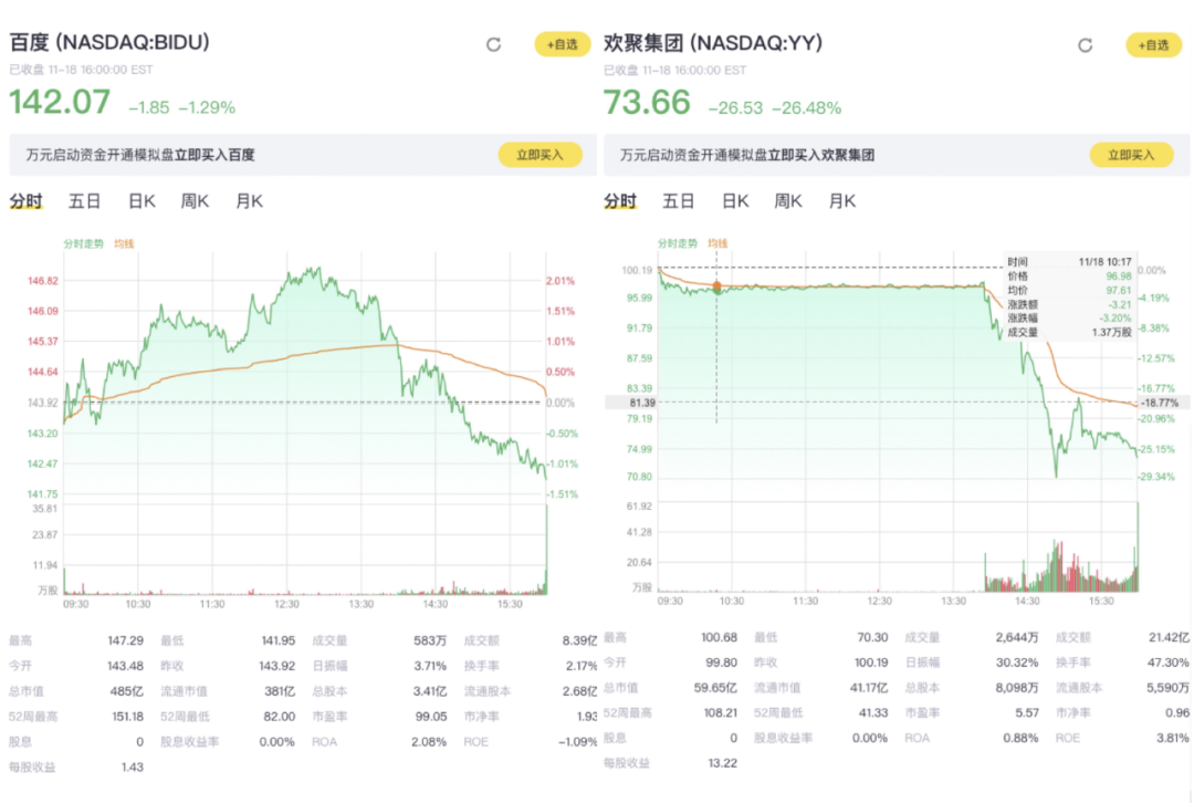 受此影响,交易双方股价下跌。其中以欢聚时代(YY)股价最为惨烈遭遇跳水,从开盘99.8美元,盘中跌幅一度逼近30%,刷新6月中旬以来盘中低点至70.60美元。最终,欢聚集团停留在收盘价73.66美元,跌幅达26.48%;百度股价也应声下挫,收盘于142.07美元,跌幅1.29%。