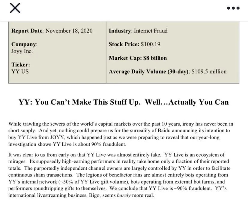 浑水做空YY,欢聚时代不干了,立即回应称:浑水的报告充满了对直播行业和直播生态的无知,报告中逻辑不清、数据混乱、以偏概全,包含了大量的错误。欢聚的及时回复稍稍挽救了极速下跌的股价。