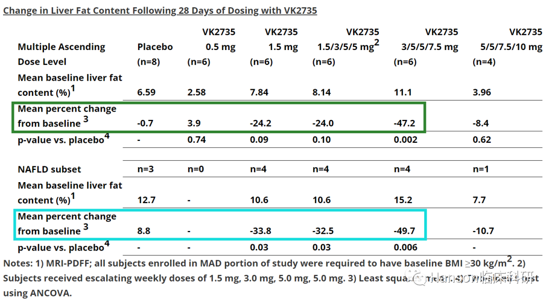 接受 VK2735 治疗的受试者肝脏脂肪较基线减少高达 47.2%。