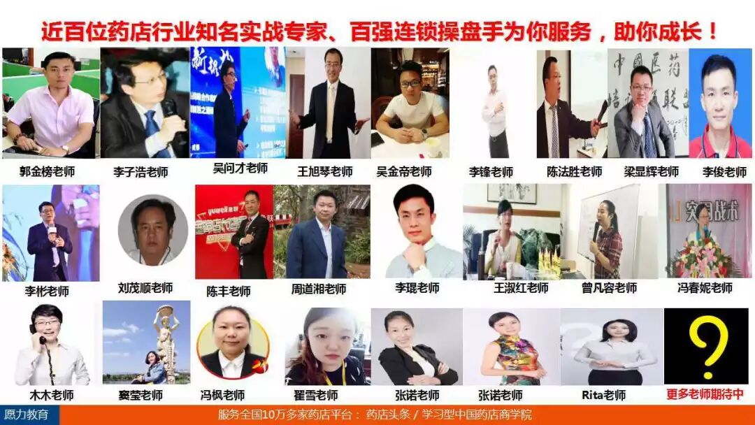 3、课程师资力量最强大,20多位来自行业百强连锁药店最实战、最专业、知名顶级的老师授课,荟萃各个老师10余年一线药品零售实操精华、管理精华。