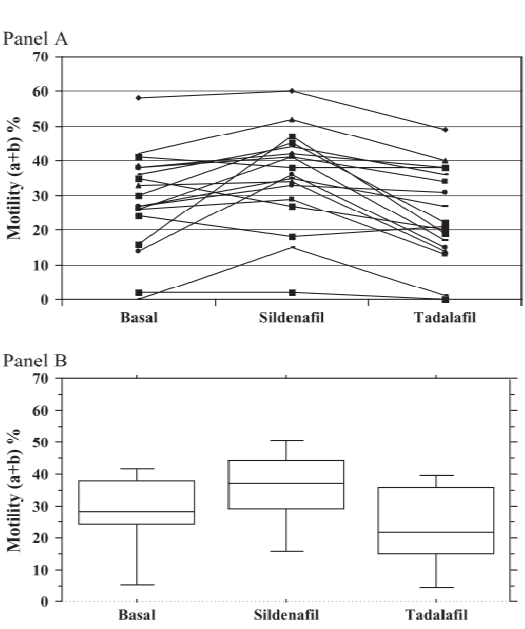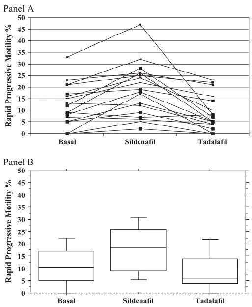 一项对比单剂量西地那非(50mg)或他达拉非(20mg)治疗后精液参数的前瞻性、随机双盲、交叉设计临床研究发现,西地那非可显著改善年轻不育患者的精子活力。